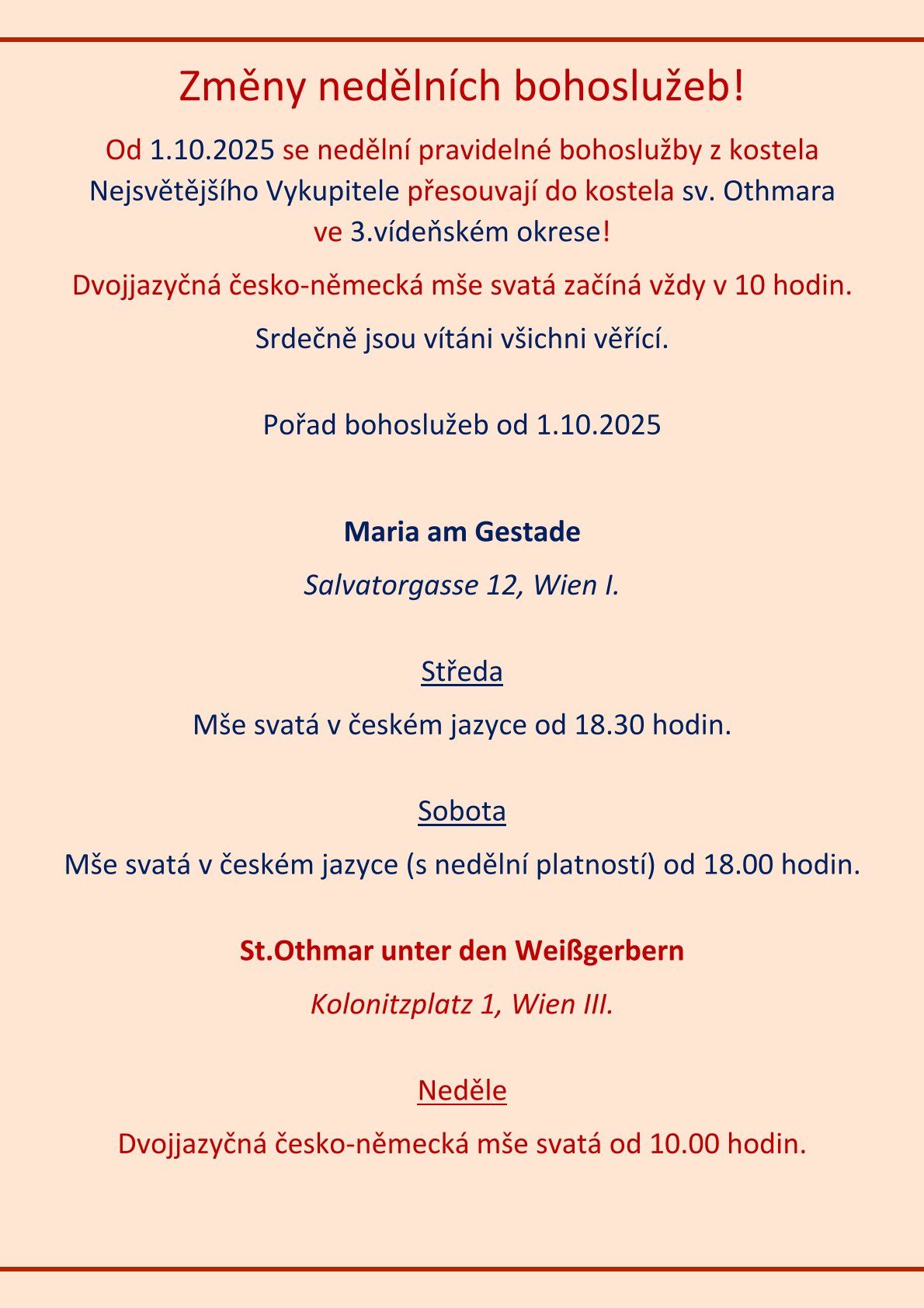 Jaká je náplň a poslání tohoto volného společenství? Především je to účast na bohoslužbách v českém jazyce v kostele Panny Marie Na Nábřeží (Maria am Gestade). V německém prostředí se snažíme zvelebovat a uchovat si mateřský jazyk. Občas si v doprovodu kytary s radostí zazpíváme národní a lidové písně. Dále pak pořádáme přednášky s náboženskou a jinou odbornou tematikou. Po nedělní mši svaté se scházíme ke společnému posezení s občerstvením a probíráme nejnovější události. Slavíme zde společně narozeniny, jmeniny a významné svátky. Navazujeme kontakty s poutníky, kteří navštěvují Vídeň a informujeme je o zdejším dění.